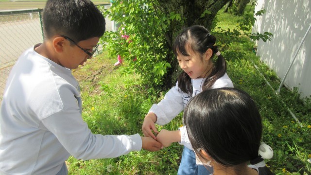 最近の1年生は、学校の生活リズムにも慣れ、毎日元気に過ごしています。休み時間になると、進んで外へ飛び出していく姿が見られるようになりました。グラウンドでは、2年生のお兄さん、お姉さんに「あっちにカエルがいるよ!」と教えてもらいながら、一緒に草むらを探検。体育館では、5年生の大きな背中を追いかけて全力で遊ぶ姿もあり、学年を超えた交流が自然と生まれています。