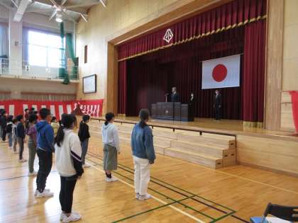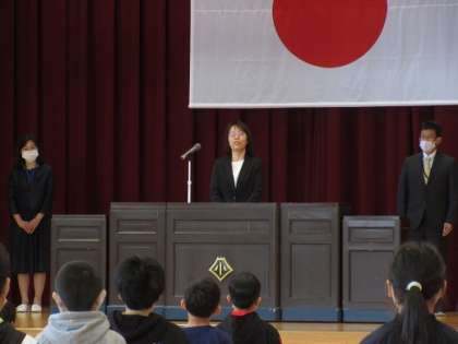 今年度、校長先生をはじめ、4名の教職員の方々が着任されました。一人ずつ自己紹介をされた後、子供たちは「よろしくお願いします」と元気に返事をしてました。