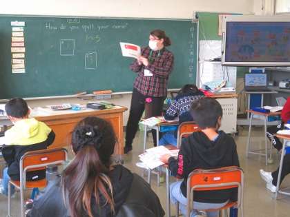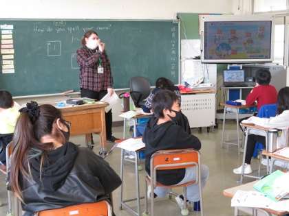 初めての外国語の授業。ALTの先生の発音をしっかり聞いて、楽しく学習しました。