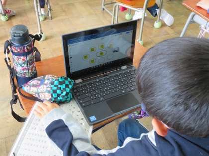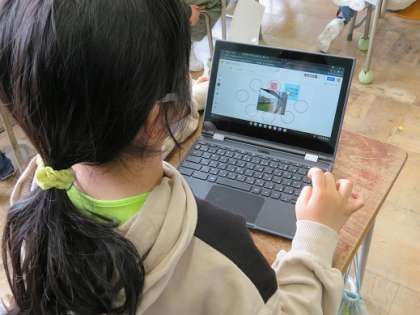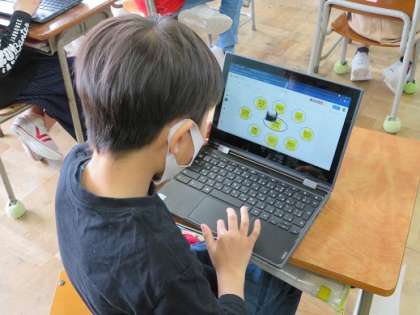 八幡のじまんと思うものをタブレットに書き込みました。自分で写した写真をPCに上手に取り込みながら、図にまとめようとしていました。PCを活用する子供たちの能力にびっくりです。