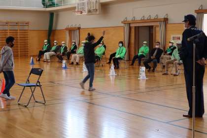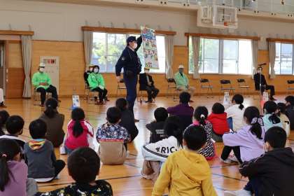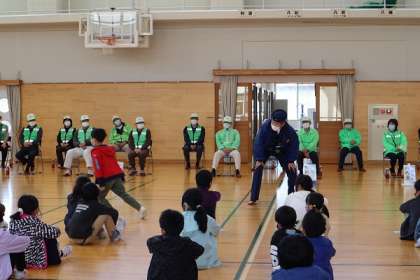 和合交番の所長さんからは、不審者に会ったときの「いか・の・お・す・し」、道横断歩道を渡るときの「止まる・見る・待つ」の大切さを、実演を交えて教えていただきました。