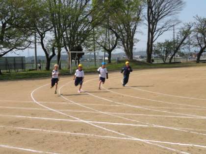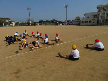 セパレートとなるカーブのコースを、腕を力強く振ることに気を付けて走りました。運動後のストレッチも忘れずに。