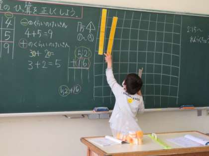 同じ位同士の数字をそろえて書き、足し算しました。ブロックを使って、ひっ算の仕方や意味を確認しました。