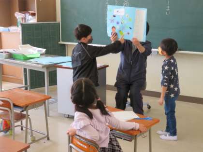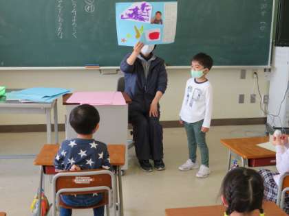 自分の好きなものを描いたカードを見せながら、自己紹介をしました。いろいろな質問を受けても、しっかり答えることができました。