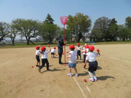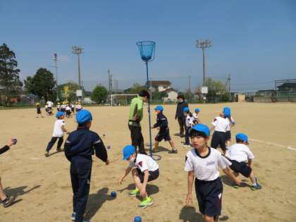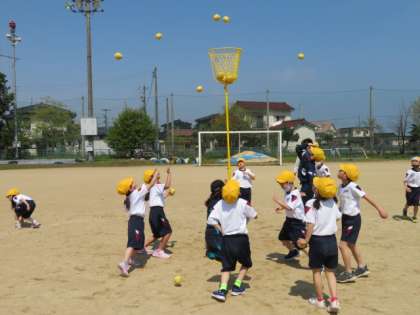 運動会で1〜3年生で行う玉入れ競技の練習を行いました。並び方や投げ方の確認をし、試しに玉も投げてみました。