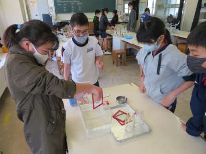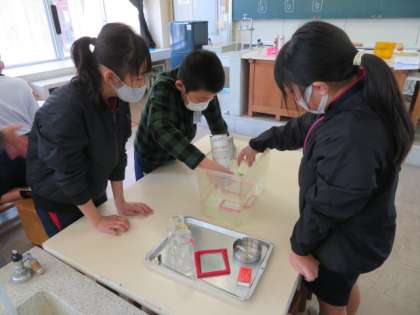 集気瓶に集めた二酸化炭素、窒素、酸素の中にろうそくの炎を入れるとどうなるのか実験しました。