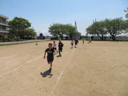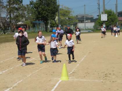 今日も元気に、全校児童がトラックを走りました。先生方も一緒に走っています。何周走ることができたかな。