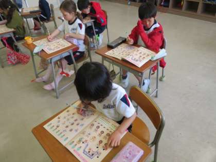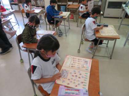 教科書の絵から、同じ数の仲間を見つけ出しました。鉛筆で確認しながら、正確に数えています。