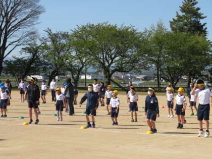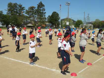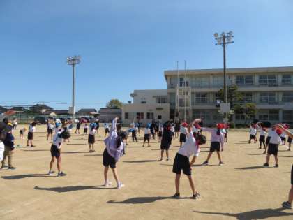 運動会の準備体操でもあるラジオ体操をしました。体を動かし、すっきりとした気分で、1日がスタートします。