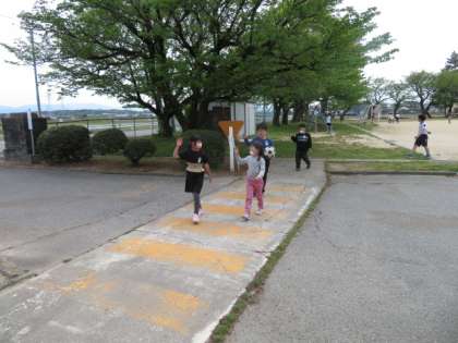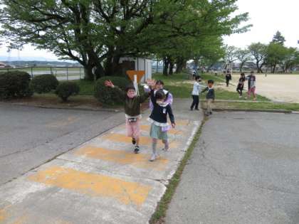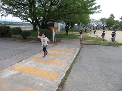 敷地内にある横断歩道。子供たちは、車の通行の有無に関わらず、手を上げて歩いています。明日は交通安全教室。交通ルールについて再度確認します。