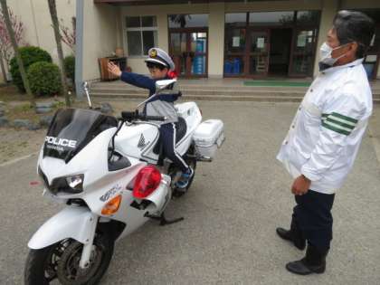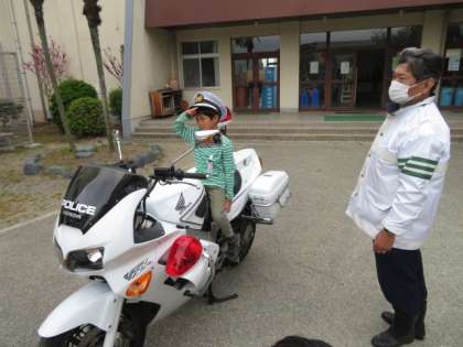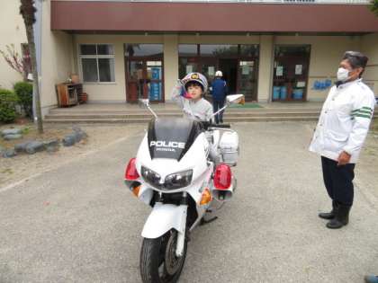 最後には、全員が白バイに乗せていただきました。今日学習した交通安全のきまりを、全体に守ります。「敬礼!」