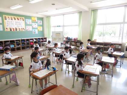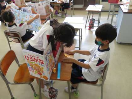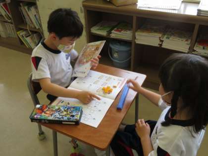 始まりの姿勢が素晴らしい。ブロックを使い、「合わせて6」になる組み合わせをお互いに答えあいました。