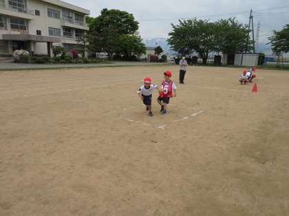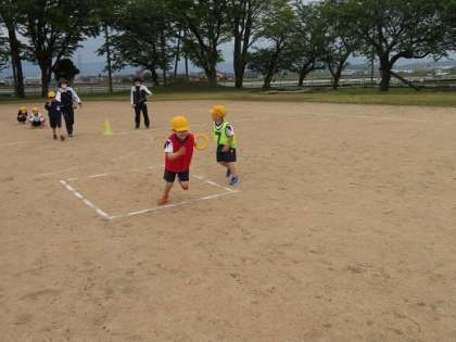 運動会で行う折り返しリレーの練習をしました。今年もリングを使って「バトン」をつなぎます。子供たち同士で走る順番を決めたり、上手にパスを渡す練習をしたりして頑張っています。
