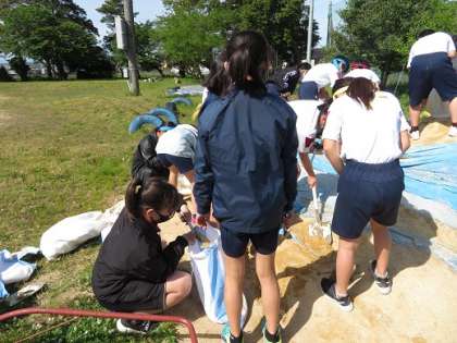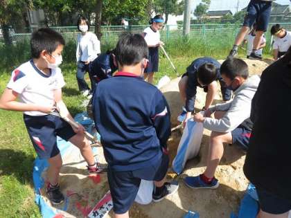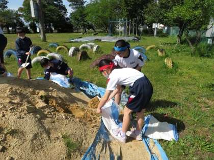 5・6年生は、テントの重しにするための土嚢を70個作りました。自分たちで運動会をつくり上げようとする気持ちが伝わってきます。