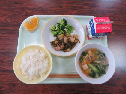 ごはん 豚肉と昆布の甘辛煮 中華スープ ゆでブロッコリー 甘夏ミカン でした。