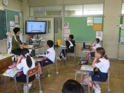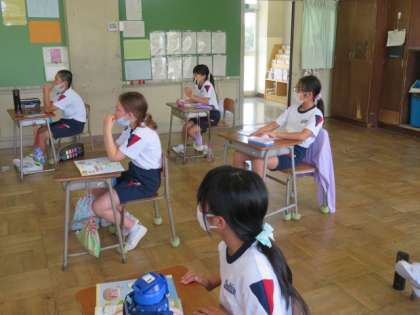 チャンツのリズムに合わせて、天気をたたずねる英会話を楽しんでいます。テンポを上げてても大丈夫です。