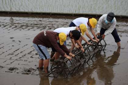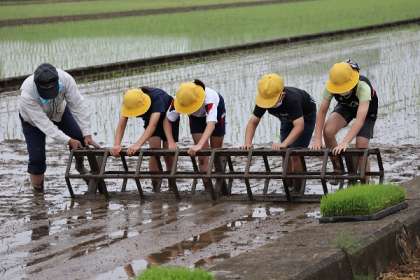 1・3・5年生が、地域の高木様の田んぼをお借りして、田植え体験をしました。始めに5年生が「転がし」という農具を使って稲を同じ間隔に植えるための無印を付けました。地域の方々や農協の職員の方々にもお手伝いしていただきました。
