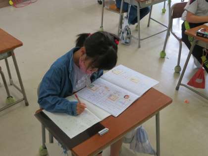 マス目の使い方に注意しながら、文を書いています。どんな文を作ることができたかな。