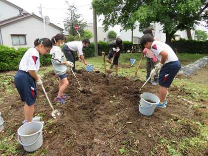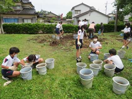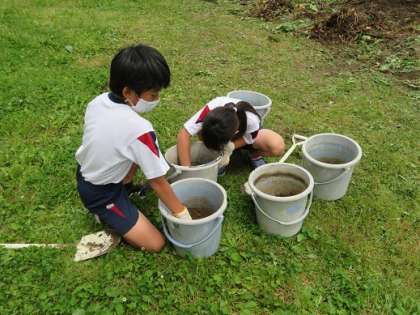 地域の高木さんにいただいた稲の苗を、バケツで育てるための準備をしました。