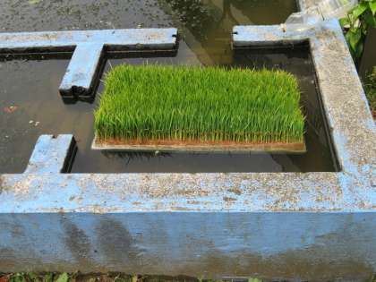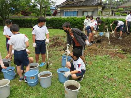 たくさんの稲を育てるために、一人3個ずつのバケツを用意し、腐葉土を入れました。バケツの中の土は重みを感じました。