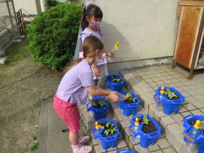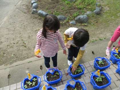 1年生も、アサガオの様子を見るのが日課となっています。早く大きく成長しないかな。