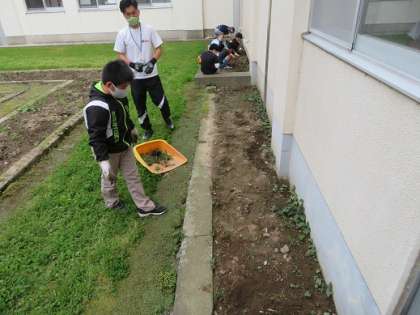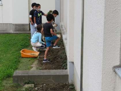 中庭の草を抜き、新しく植える花のためにマルチを敷きました。みんな協力し合い、きれいにしました。