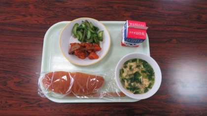 コッペパン 鶏肉とレバーのケチャップからめ ニラ玉スープ くきわかめサラダ でした。