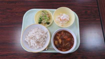 麦ごはん 食べキリンハヤシ 豆サラダ フルーツヨーグルト でした。