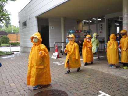 あいにくの雨模様となってしまいましたが、合羽を着込み、こども未来館に到着しました。みんな元気です。