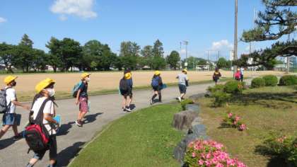 6年生が全校児童に見送られながら、校外学習に出発しました富山富山県埋蔵文化財センター、富山県庁を見学してきます。