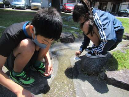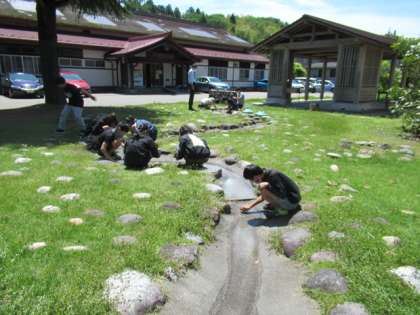 勾玉の穴があき、形を整えるべく、水辺で石を削ります。