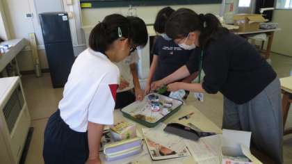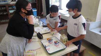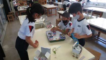 発芽した植物が、この後もっと大きく成長するための条件として、肥料と日光をあげ、比較して実験するための準備をしています。