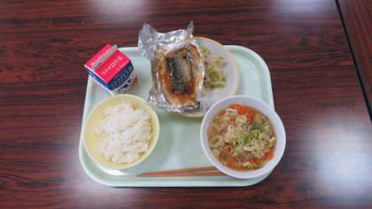 ごはん かしわうどん 鯖の銀紙焼き 甘酢和え でした。