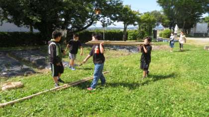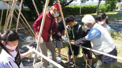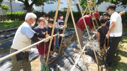 地域の方が来校し、野菜の棚の作り方を教えいただきました。子供たちは縄の結び方を教わりながら丈夫で立派な棚を作りました。