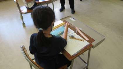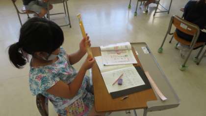「1cm」より短い「mm」という単位を学びました。長さを測る道具として「30cmものさし」が配られました。木製ではなく、プラスチック製です。早速、いろいろな物の長さを測っています。