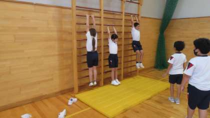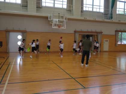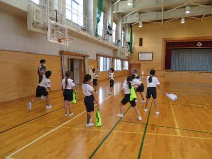 肋木で体をほぐした後、ボールを投げる練習をしました。タオルの代わりにビブスを用いて投げる時の時のフォームをチェックしました。