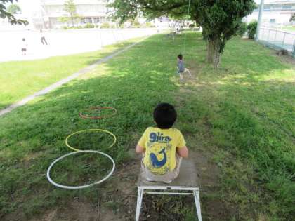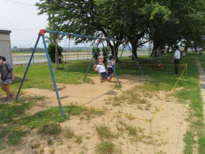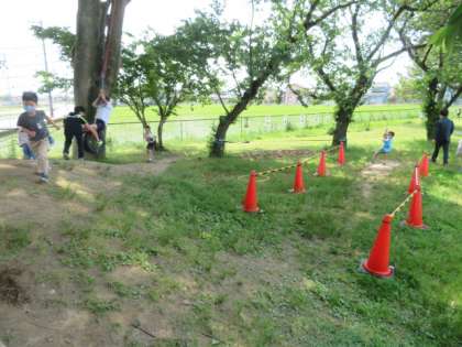 八幡の森にある遊具や滑り台で安全に遊ぶことができるように、仕切りや待機場所となる目印を置きました。子供たちは、状況を判断しながら遊んでいました。