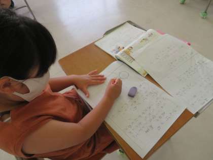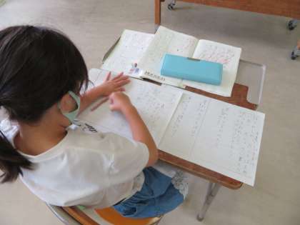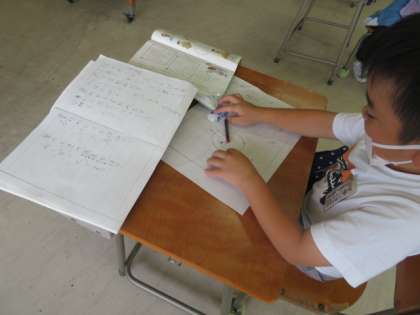 内容を項目別にメモとして書きとめ、構成を考えながら運動会の作文を書きました。マス目を意識して、丁寧な字で書いています。