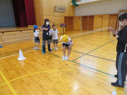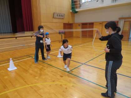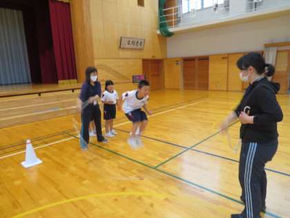 大縄の8の字跳びの練習をしました。縄に入るタイミングや跳ぶ場所、駆け抜けるコースなどに気を付けながら練習しました。少しずつ以前の体の動きを取り戻していました。