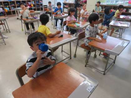毎週金曜日にフッ素洗口を実施しています。口の中で約1分間、薬を溜め、歯をはじめ口内の衛生を保ちます。味は苦く、1年生にとっては、まだまだ苦手な子供が多いようです。