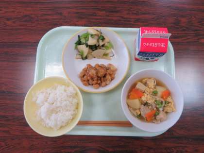 ご飯 卵とじ 大豆とホタテのごまからめ 昆布和え でした。 大豆は、八幡校区で生産されたものです。