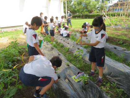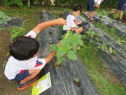 自分の育てている野菜がどのくらい成長したか、紙テープを使って確かめました。毎日のお世話のおかげで、ぐんぐん成長しています。