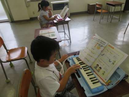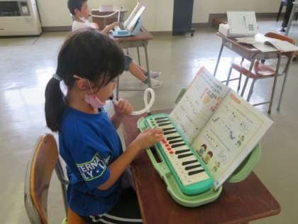 指の使い方や息継ぎの仕方をしっかり確認しながら、鍵盤ハーモニカの練習をしました。