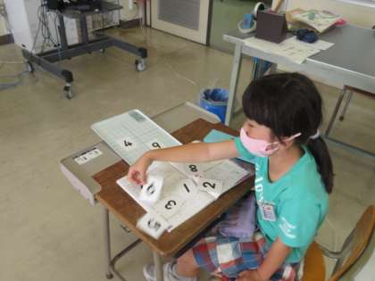 足し算の筆算が正しい答えになるように、当てはまる数字を考えました。繰り下がりがポイントでした。