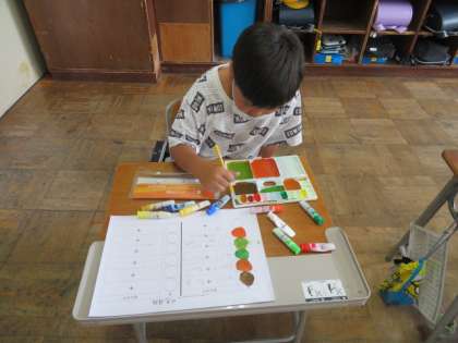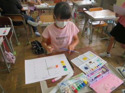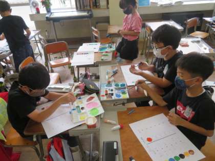 2色の水彩絵の具を合わせるとどんな色になるのか、実験しました。全く違う色に変身したり似たような色に少しずづ変化したり、これからの作品つくりに生かせそうでう。