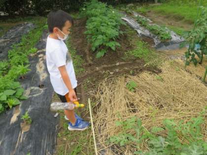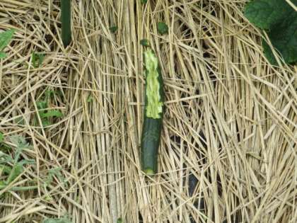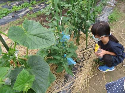 いつものように朝の水やりに農園で行くと、何と、大きくなっていたきゅうりがご覧のとおりに。鳥に食べられたのかもしれません。しっかりと対策を考えなくてはいけません。