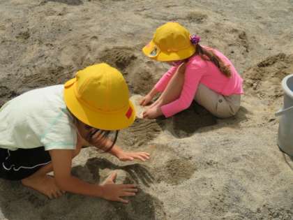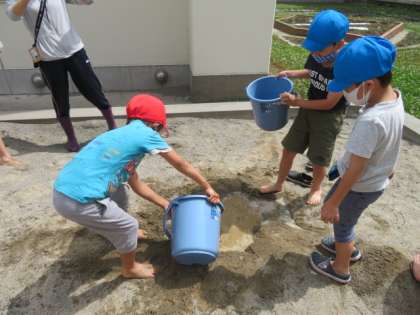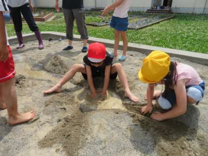 中庭にある砂場で、思いっきり遊びました。山を作ったり、水を流したり、手足を砂に埋めたりと、夢中になって遊びました。