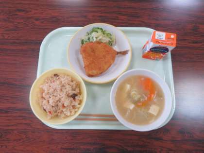 五目ご飯 打ち豆汁 あじフライ きざみ和え オレンジジュース