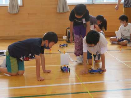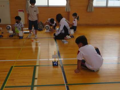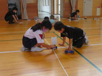 風力によって、車が動く距離がちがうのか、体育館で実際に測って確かめました。結果はどうだったでしょう。