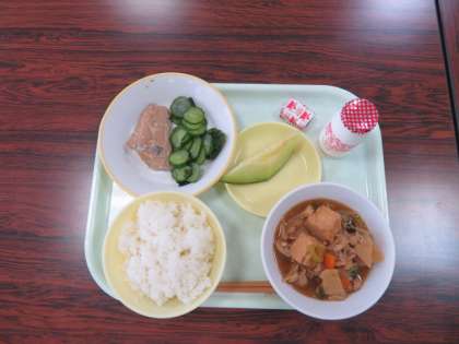 ごはん 厚揚げの味噌炒め 鰆のゆうあんやき 酢の物 メロン チーズ ヨーグルト でした。
